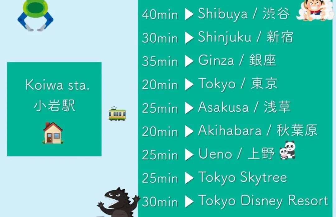 The 1-room Koiwa Detached House 小岩駅にある戸建のおうち 完全分離型住宅2F Apartment is located at a distance of 800 metres from Koiwa train station and merely a 5-minute walk from Catholic Koiwa Church.
